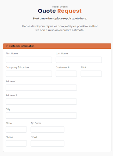 Gather the item(s) to be serviced and use our online quote request form to detail the services or repairs needed for each handpiece, and upload images of each item. Don't send us your item(s) until we have had a chance to respond to your submittal.